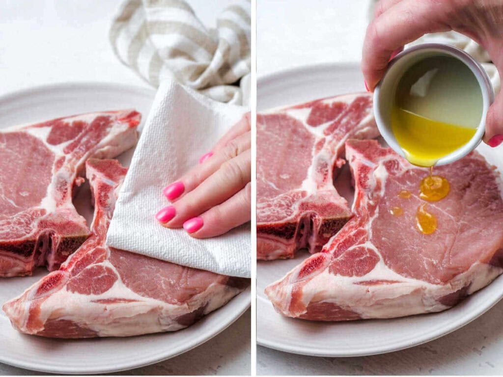 - Pat the pork chops dry with paper towels, then drizzle both sides with olive oil.