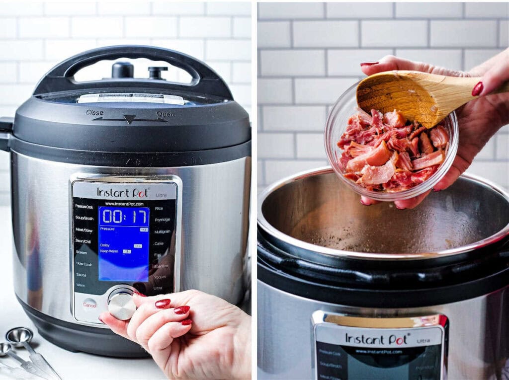 - Open the pressure cooker and remove the pork. Remove any meat from the bones and return to the pot (or stir in other ham chunks).