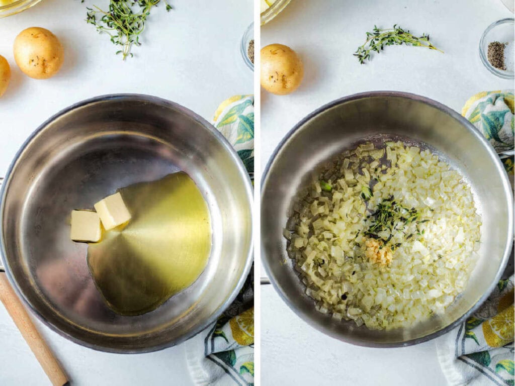 SAUTE ONIONS. Start by melting butter and olive oil over medium heat in either a large pot or a large Dutch oven. Cook diced yellow onions until tender, and then stir in chopped garlic and fresh thyme leaves, and cook another minute or so until the mixture is fragrant.