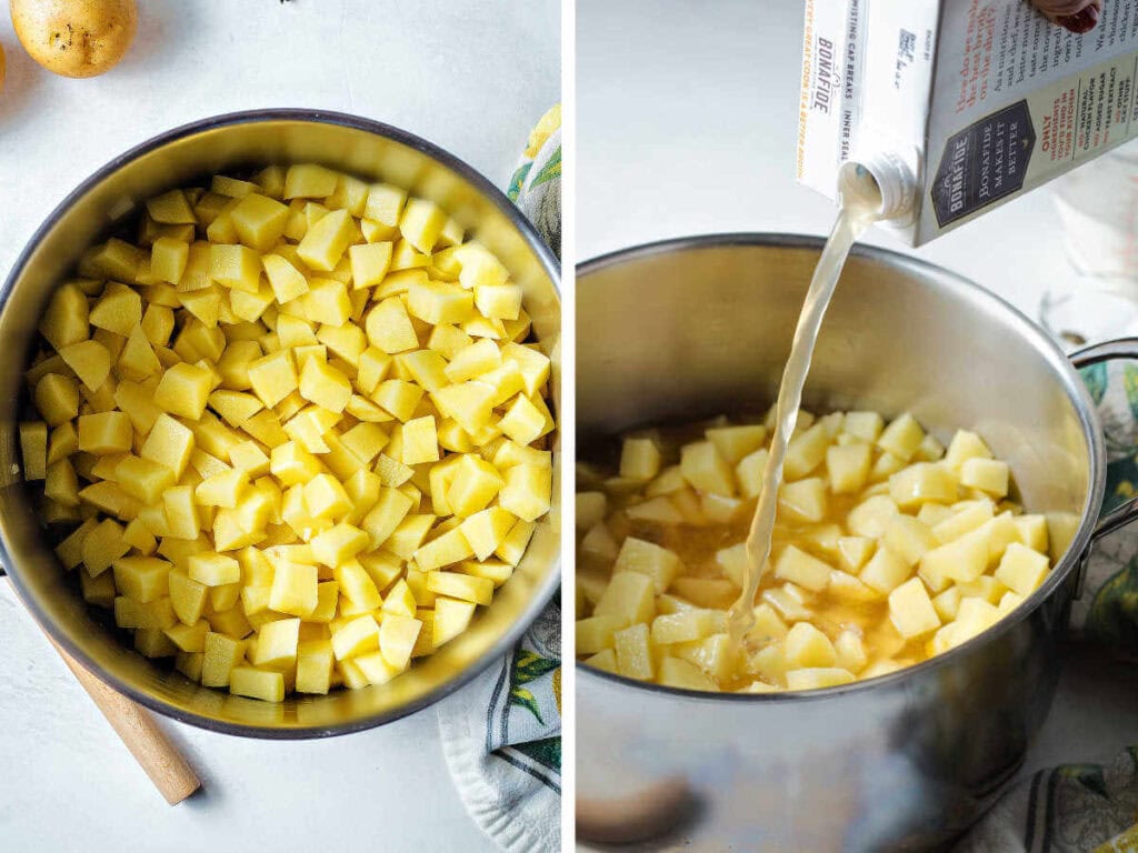 - Add the chicken broth and diced potatoes to the pot. After the mixture begins to boil, cook for 10 minutes or until the potatoes are fork-tender.