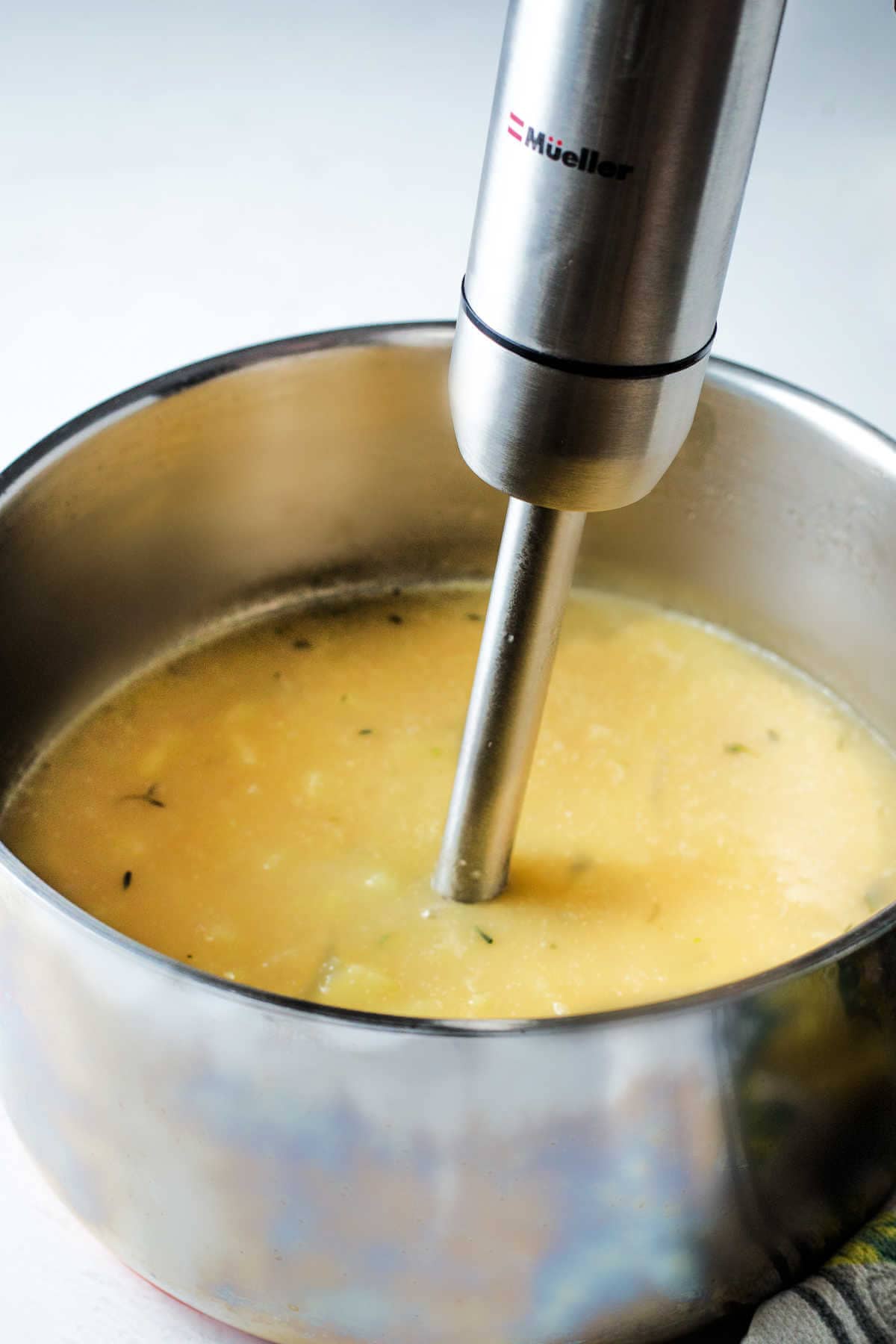 - Mash or blend lightly. I like to blend it just slightly, so that it has a smooth, creamy texture but still has some chunks! If you don’t have an immersion blender, a few quick presses with a potato masher would work, or just blend part of the soup and put it back in the pot.